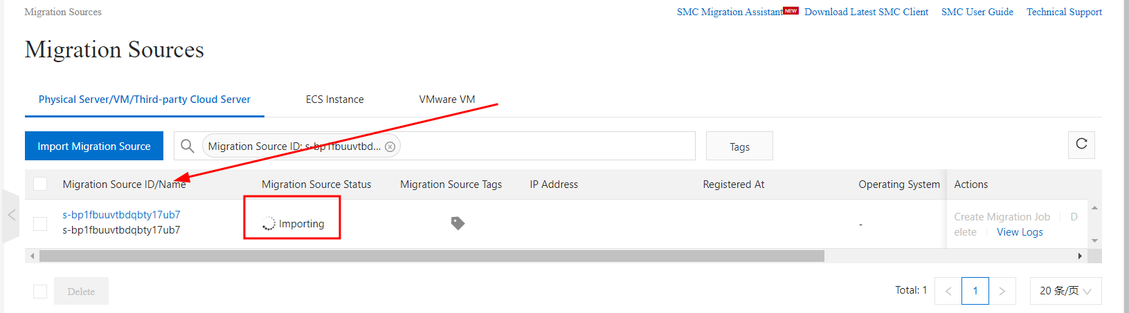 Quá trình Import mất khoảng 3 đến 10 phút. Hãy đợi cho đến khi quá trình import hoàn tất, bạn có thể xem trạng thái import trên trang Nguồn di chuyển. Nếu giá trị trong cột Trạng thái thay đổi từ importing thành active đối với Migrate source, thì thông tin của Migrate source sẽ được nhập.