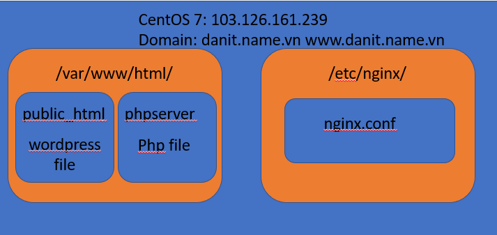 Ta có một server CentOS 7, có IP và domain, trong thư mục /var/www/html/public_html chứa các file liên quan đến wordpress, thư mục /etc/nginx chưa các file cấu hình của nginx.