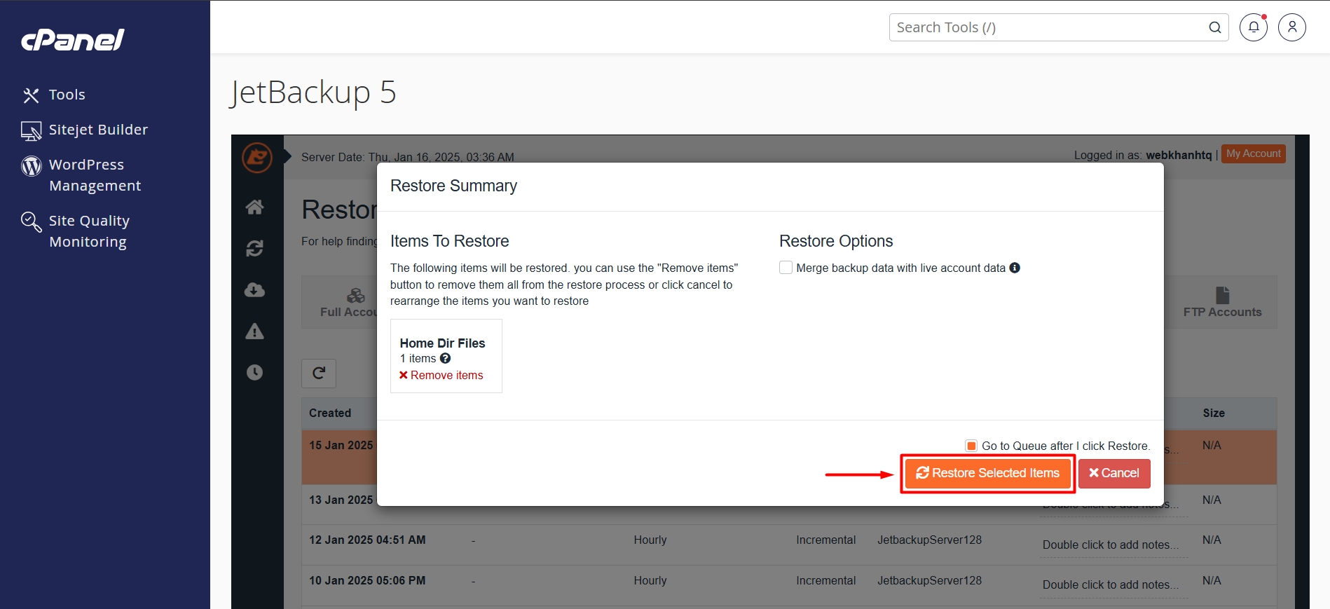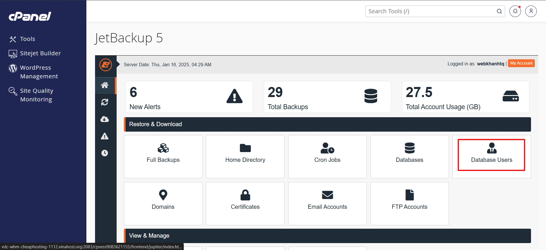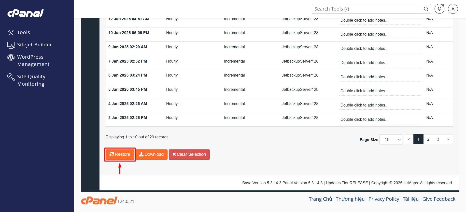 Bài viết này hướng dẫn các bạn sử dụng JetBackup để khôi phục tài khoản cPanel, mã nguồn, cơ sở dữ liệu trên dịch vụ Shared Hosting (cPanel, Linux). Nếu bạn cần hỗ trợ, xin vui lòng: