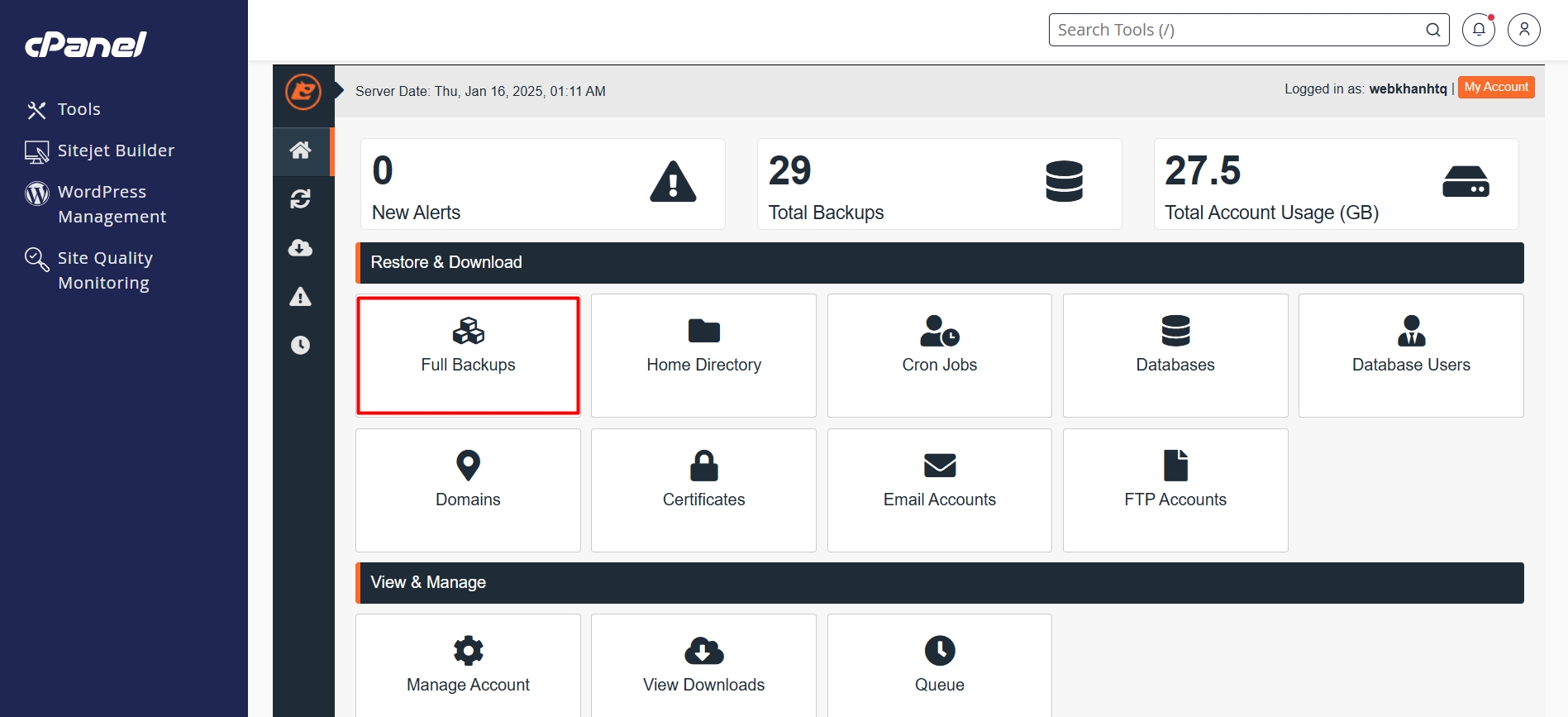 Để khôi phục tài khoản cPanel, trong giao diện chính JetBackup, chọn Full Backups.