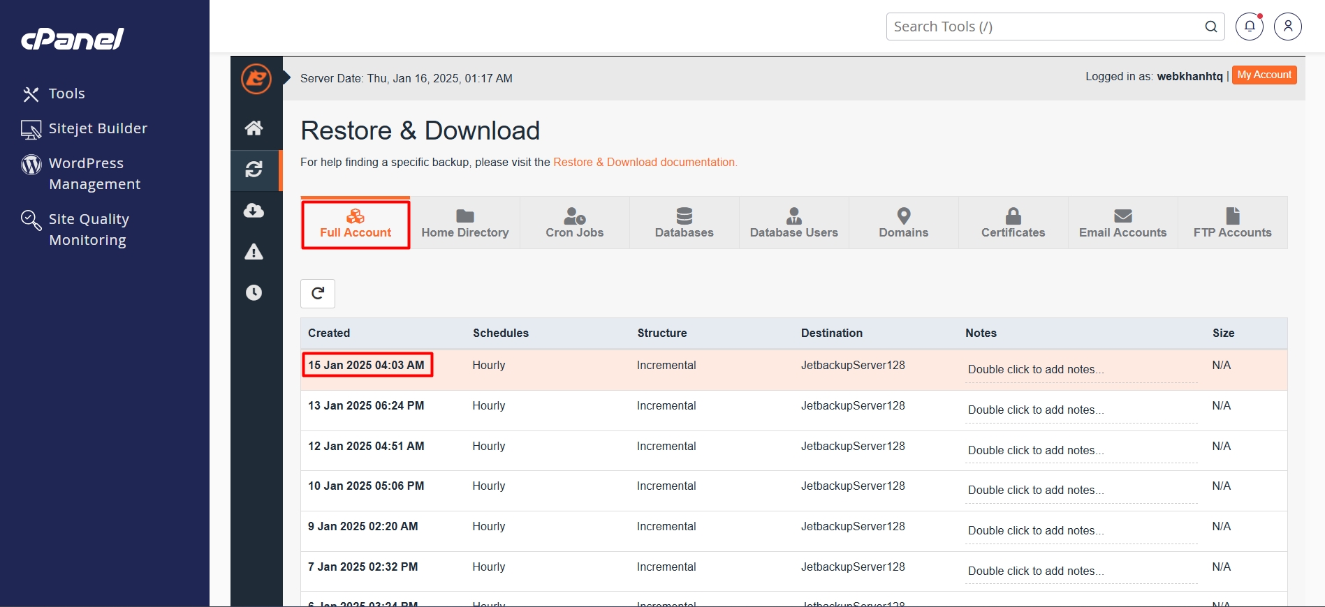 Thông tin thêm: Bạn cũng có thể chọn Download (bên phải nút Restore) để tải xuống bản sao lưu tài khoản cPanel.