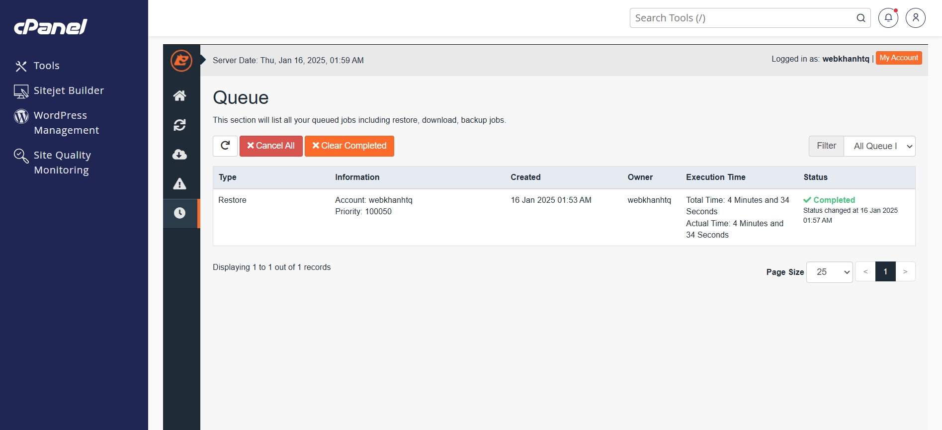 Bạn sẽ được chuyển hướng đến giao diện Queue để xem tiến trình khôi phục. Trạng thái "Completed" có nghĩa là khôi phục thành công.