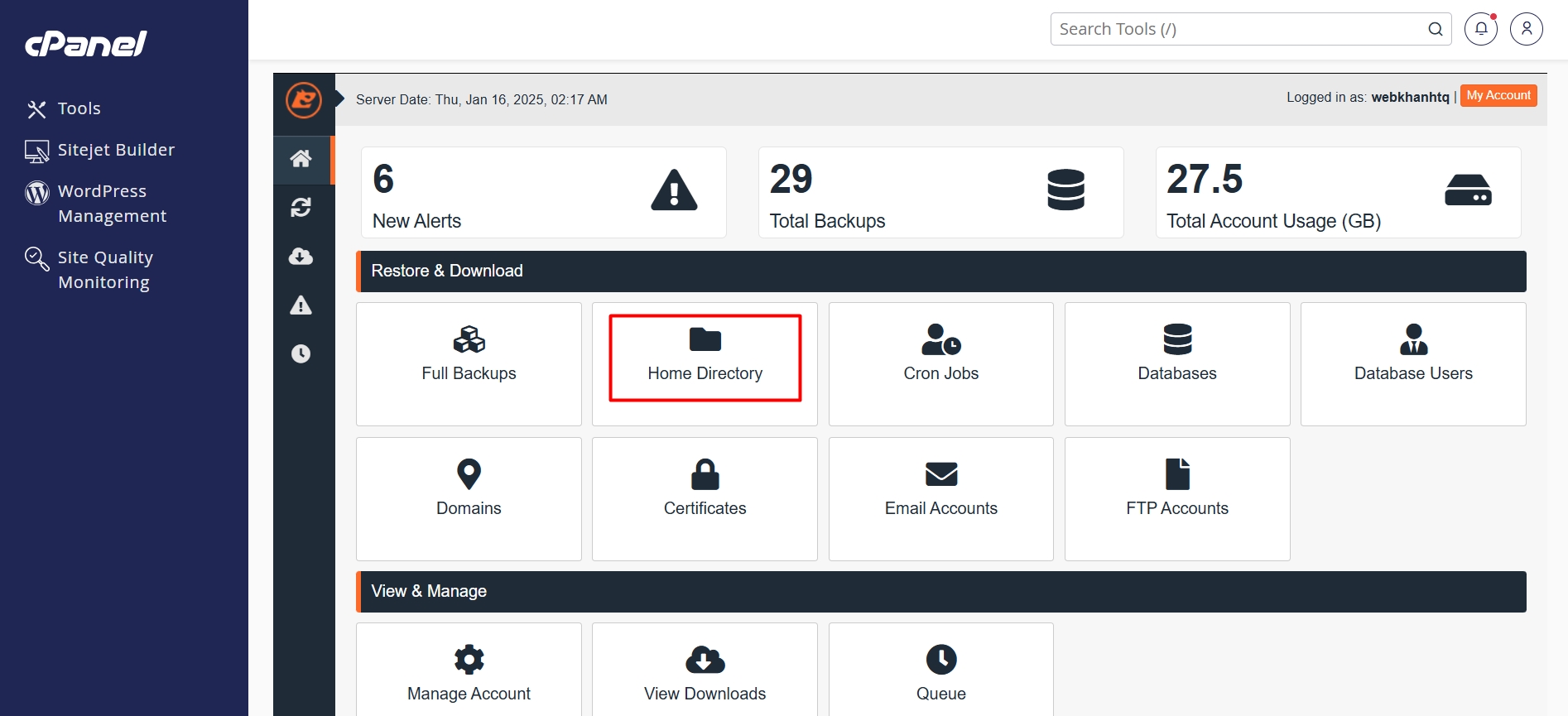 Để khôi phục tài khoản cPanel, trong giao diện chính JetBackup, chọn Home Directory.