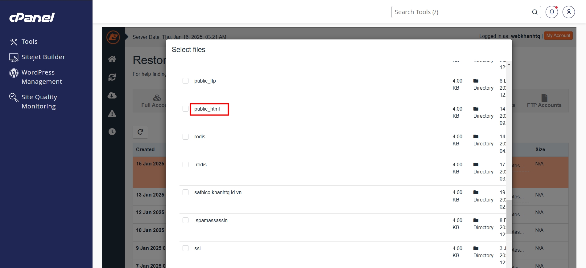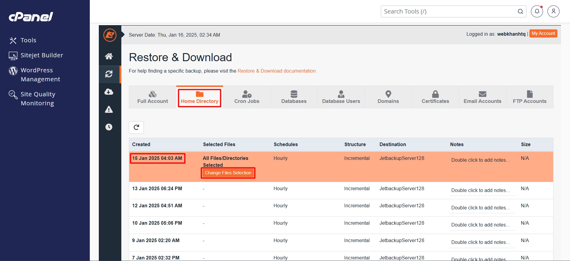 Đảm bảo bạn đang ở thẻ Home Directory như hình dưới. Chọn thời điểm sao lưu mà bạn mong muốn để khôi phục toàn bộ thư mục gốc của tài khoản.
