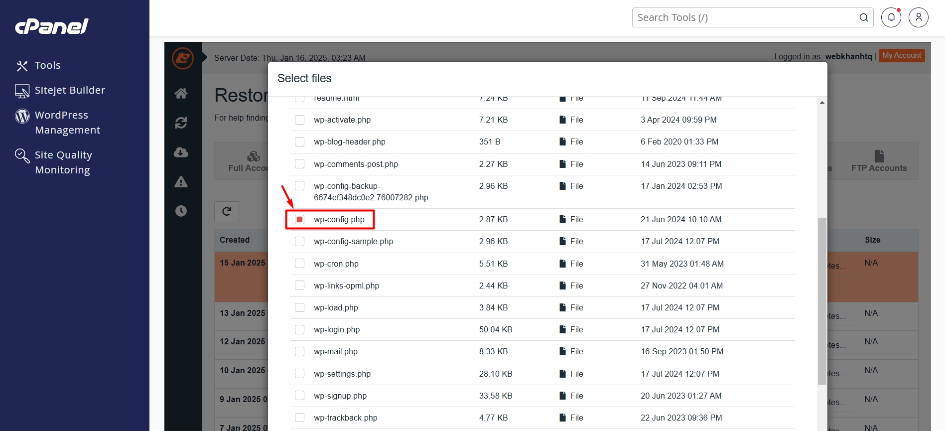 Nếu bạn chỉ muốn khôi phục tệp public_html/wp-config.php như đã đề cập, chọn Change Files Selection > public_html > tích chọn wp-config.php.