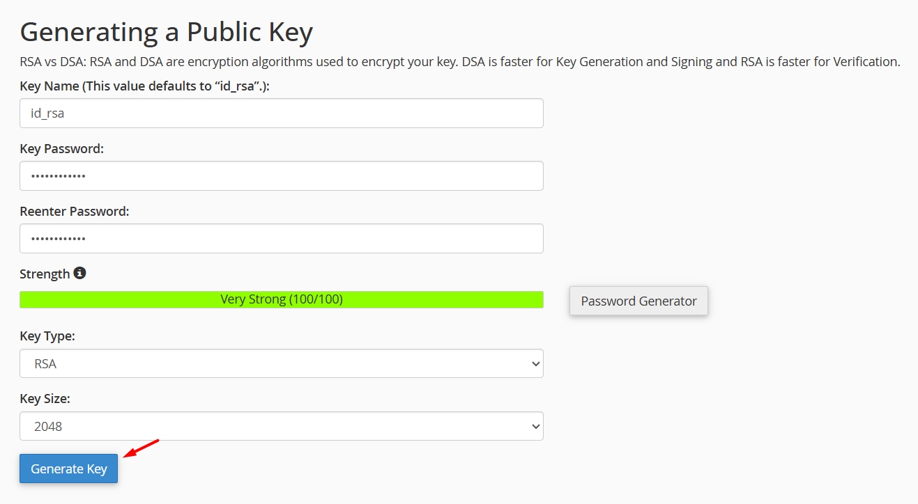 Nhấn Generate key để bắt đầu tạo SSH key.