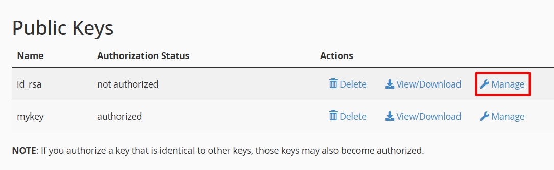 Chọn Manage tại SSH key cần ủy quyền truy cập.