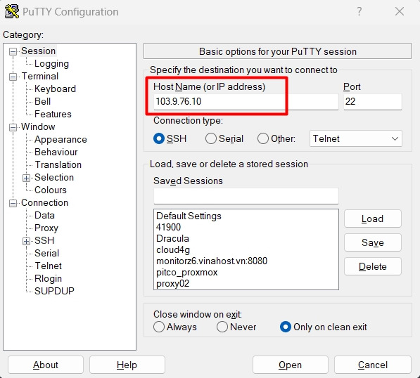 Mở phần mềm PuTTY. Nhập địa chỉ IP của hosting vào trường Host Name (or IP address).