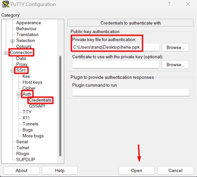 Tại thanh điều hướng bên trái, chọn Connection > SSH > Auth > Credentials để chọn tệp private key đã tải về máy cá nhân.