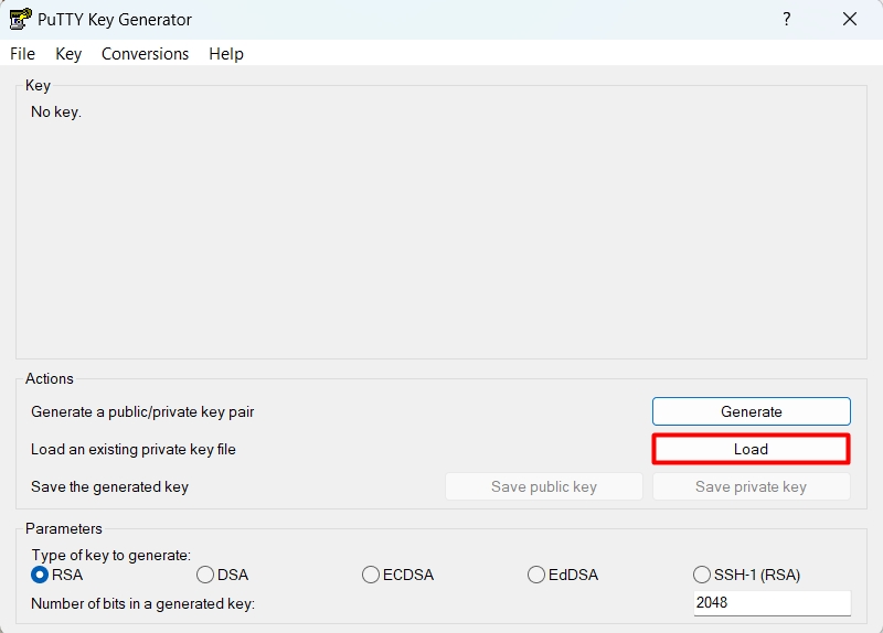Mở PuTTYgen - phần mềm được cài đặt cùng PuTTY. Chọn Load để tải nội dung private key đã tải về.