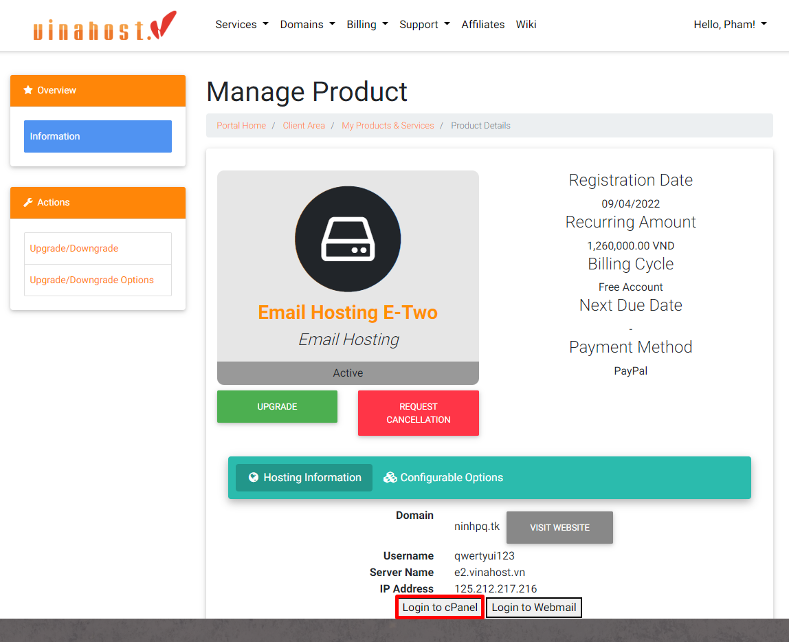 Bạn đăng nhập vào quản trị dịch vụ tại trang chủ của Vinahost