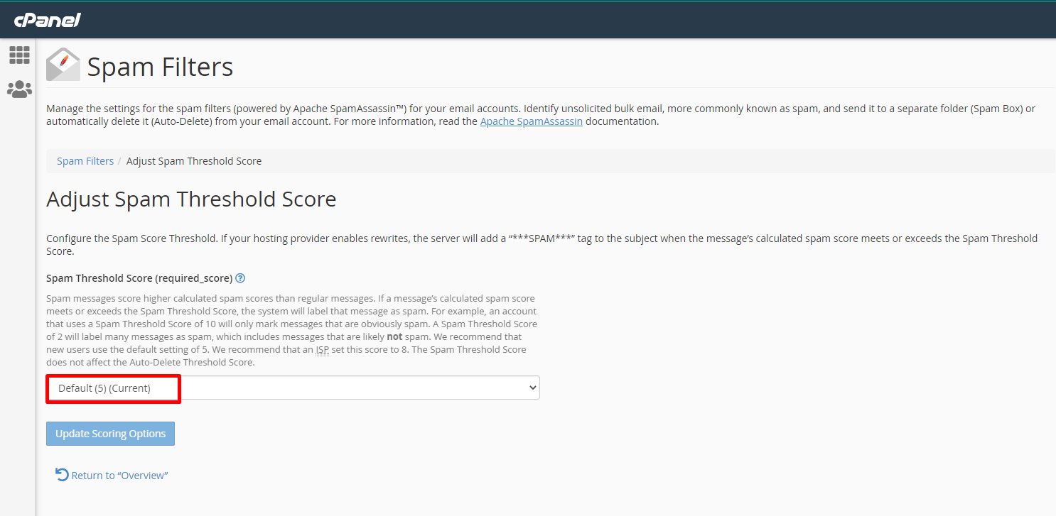 Sau khi Update Scoring Options bộ lọc mail sẽ được kích hoạt ngay trên hệ thống của bạn. Với bộ lọc này sẽ ngăn chặn Email Spam đến Email Hosting của bạn