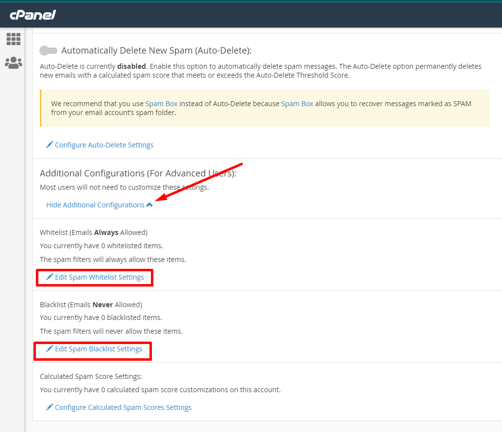 Tại giao diện Spam Filters bạn chọn dòng Show Additiional Configurations, sau đó tiếp tục chọn mục Edit Spam Whitelist Setttings như ảnh bên dưới.