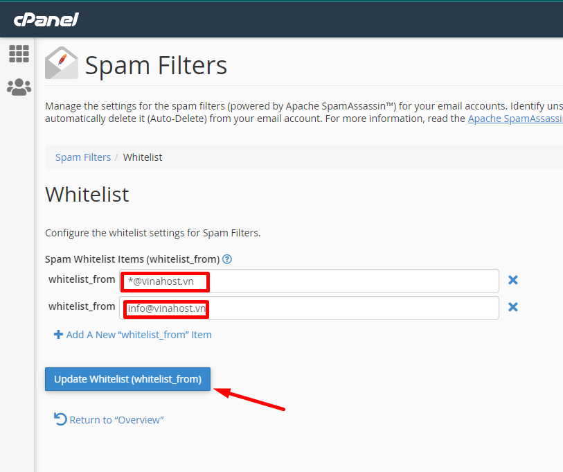 Sau khi đã thêm hoàn tất bạn chọn Update Whitelist (whitelist_from) để cập nhật.