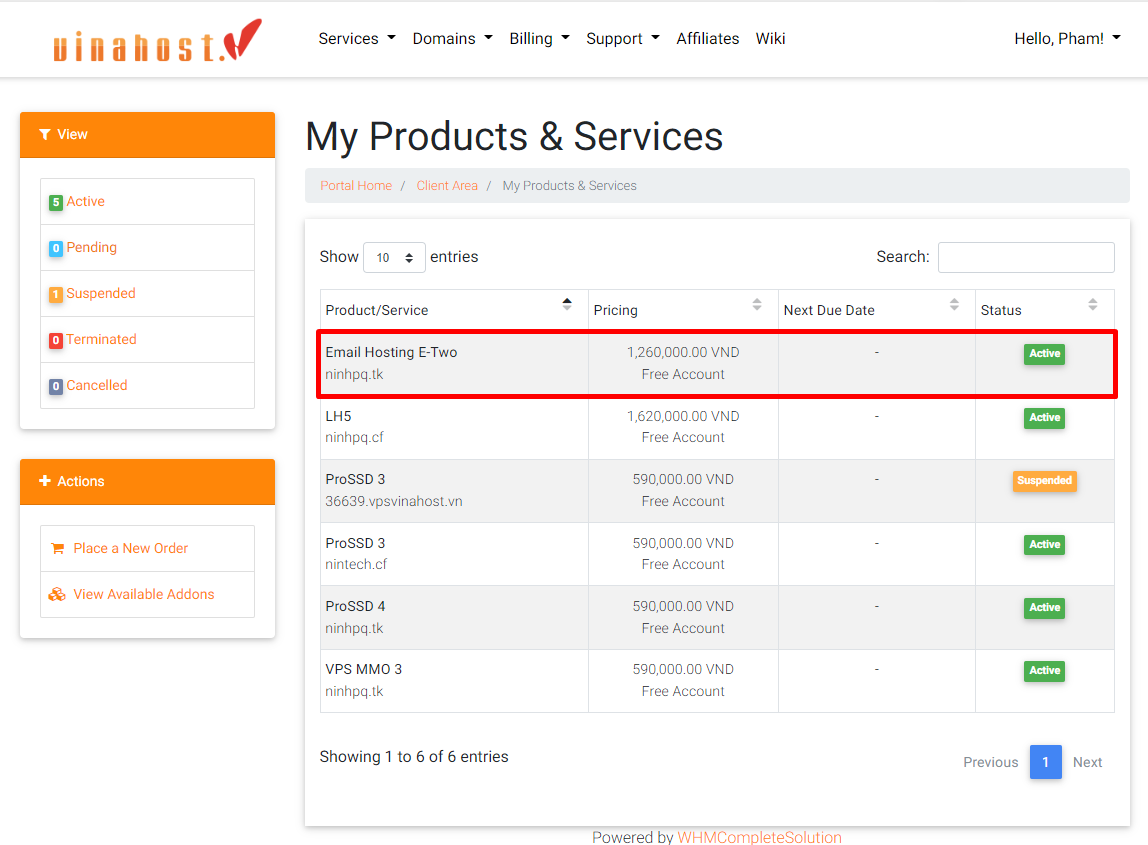 Chọn Dịch vụ(Services) => Dịch vụ của tôi (My Services) chọn gói dịch vụ Email Hosting tương ứng.