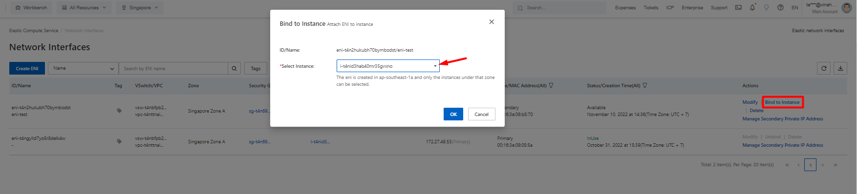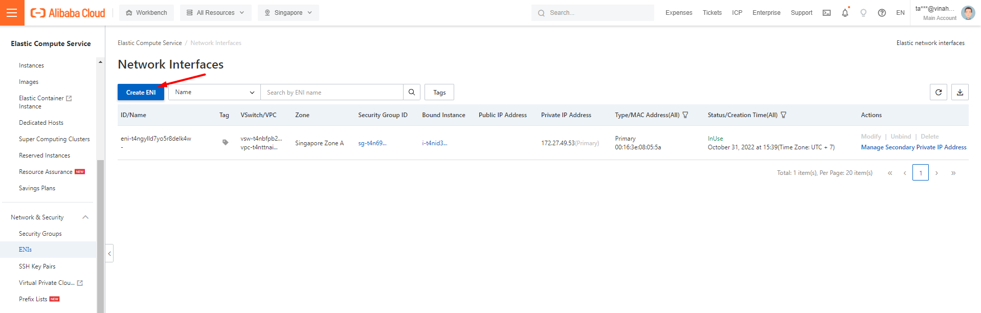 - VPC & Vswitch: phải trùng zone với ECS muốn gán ENI