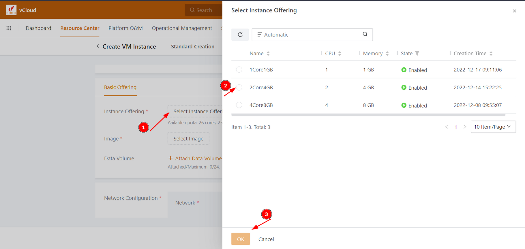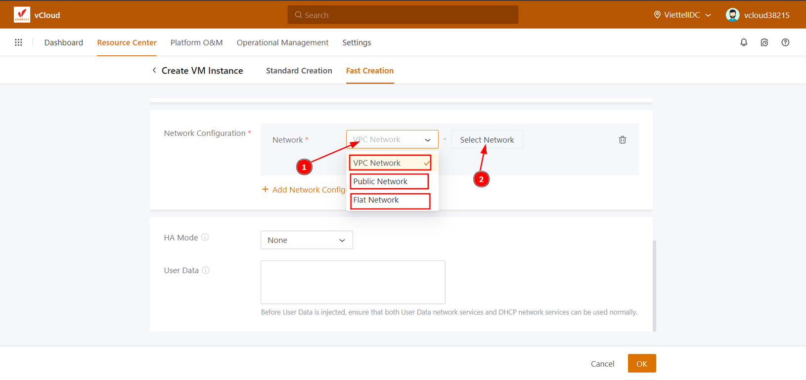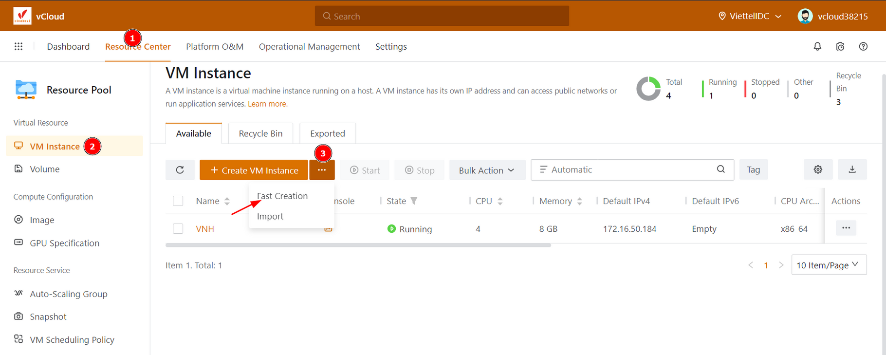 1. Sau khi login vào hệ thông chọn Resource Pool > VM Instance sau đó nhấp vào dấu 3 chấm cạnh nút Create VM Instance và chọn Fast Creation