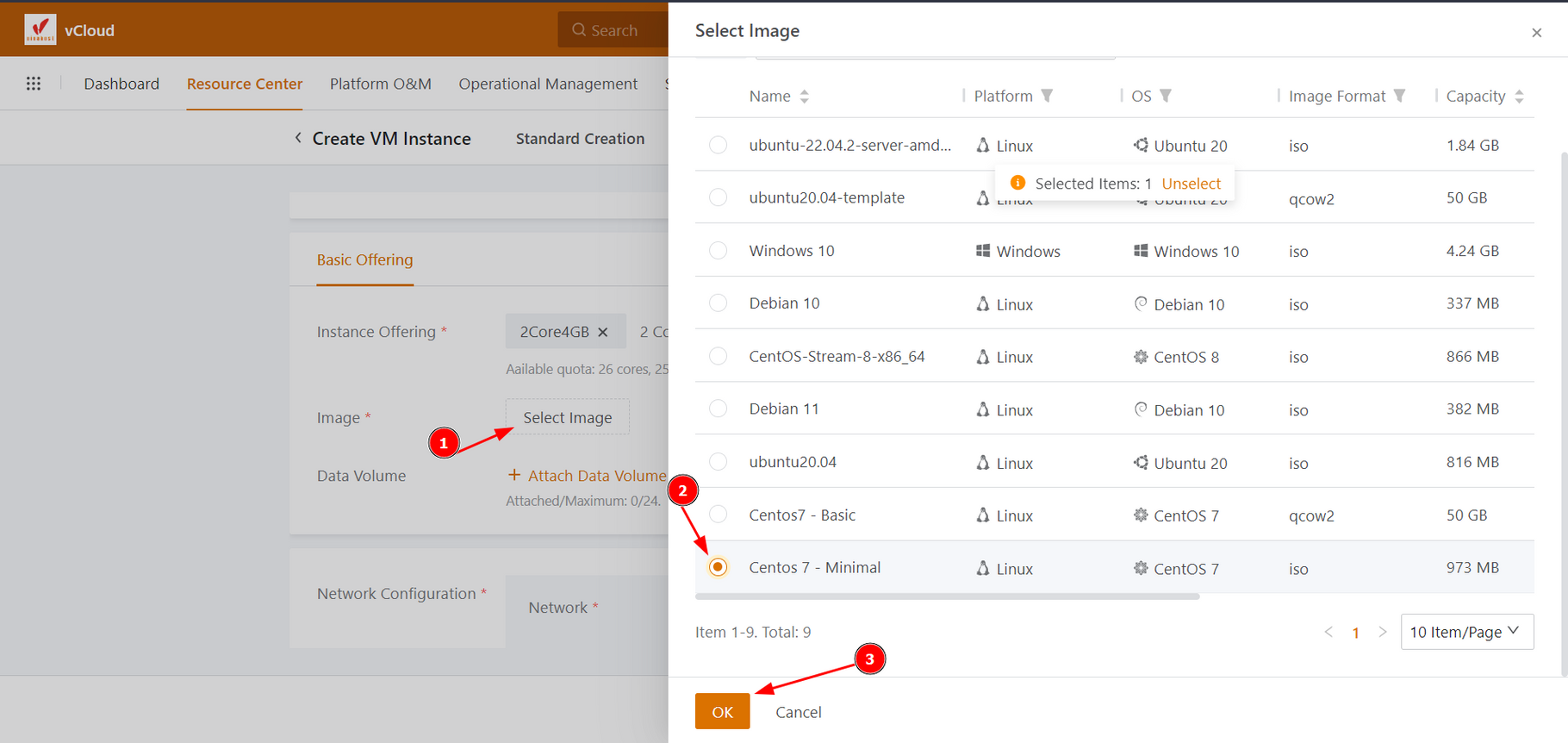 Ở đây mình chọn VM có cấu hình là 2 CPU và 4GB RAM và chọn OS là Centos & Minimal và có dung lượng Disk là 20GB. Các bạn có thể chọn cấu hình theo nhu cầu tùy ý và tài nguyên của gói cho phép