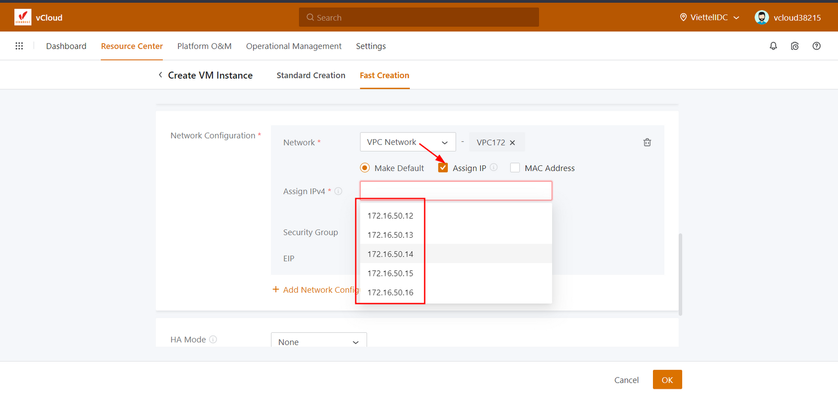 Các bạn có thể chỉ định địa chỉ IP cho VM bằng cách tích chọn vào Assign IP và chọn IP mong muốn, hoặc bỏ trống để hệ thống tự cấp DHCP