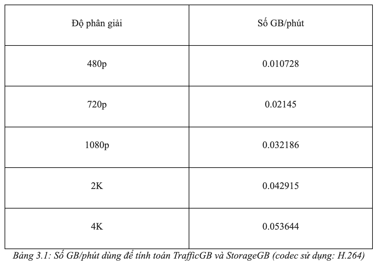 - Storage GB (Start) = Transcoding Minute * số GB/phút (xem ở bảng 3.1)