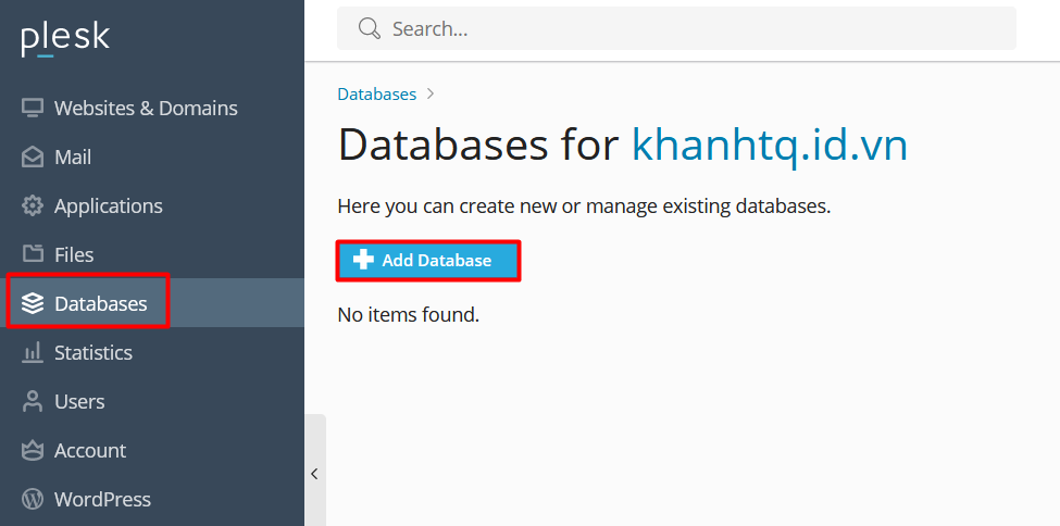 Tìm trên giao diện Plesk, vào phần Databases và chọn Add Database.