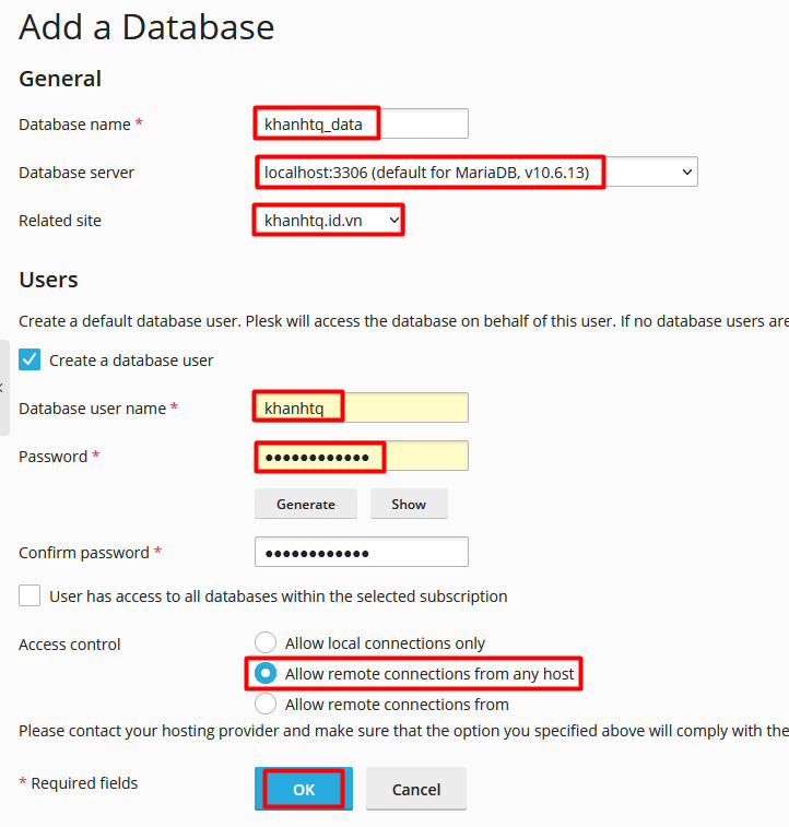 Nhập tên database. Chọn database server. Chọn website sử dụng database này. Tạo user, mật khẩu cho user và tích vào Allow remote connections... để cho phép kết nối từ xa đến database.