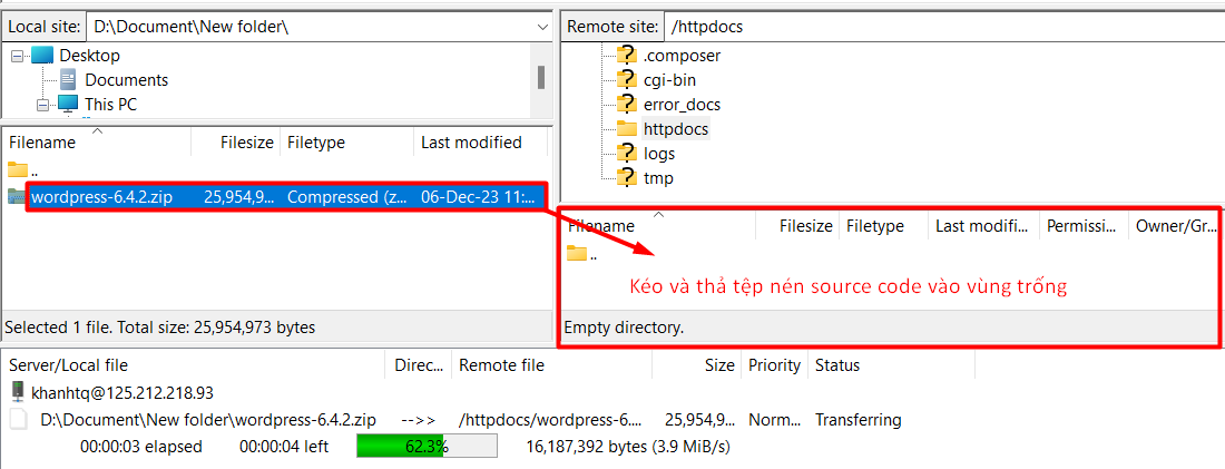 Click vào tệp nén source code, kéo và thả tệp từ phần Local site sang Remote site.