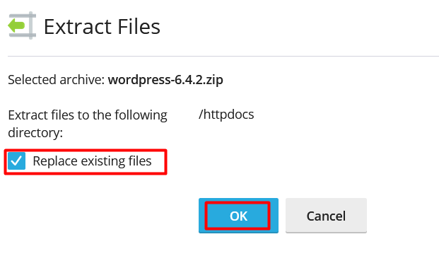 Tích vào Replace existing files để ghi đè các tệp trùng tên đang tồn tại (nếu muốn) và nhấn OK.