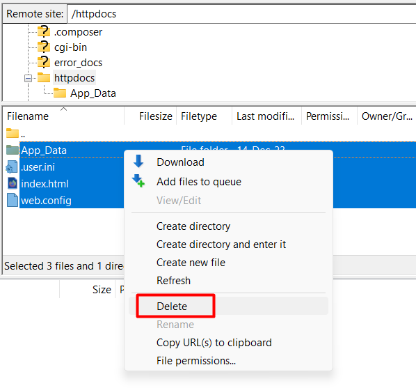 - Phần Remote site hiển thị cây thư mục và các thư mục, tệp của remote host