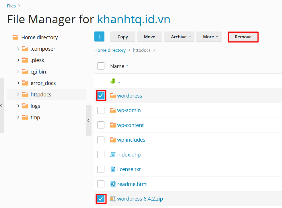 Sau khi quá trình di chuyển hoàn tất, có thể an toàn xoá tệp nén source code và thư mục rỗng (do đã chuyển hết tệp và thư mục ra ngoài).