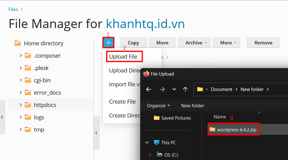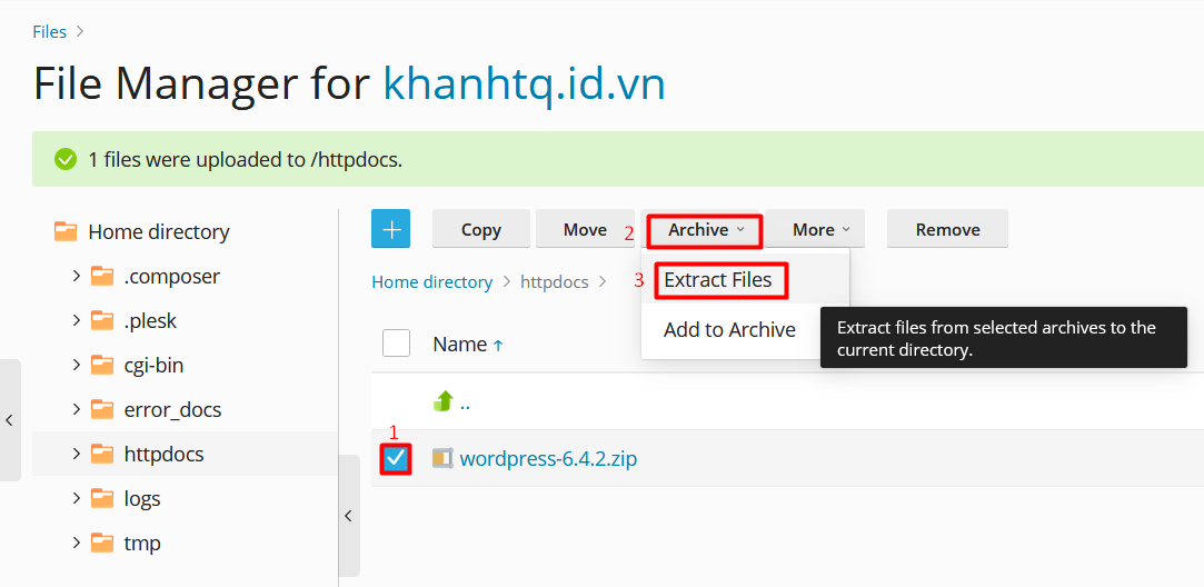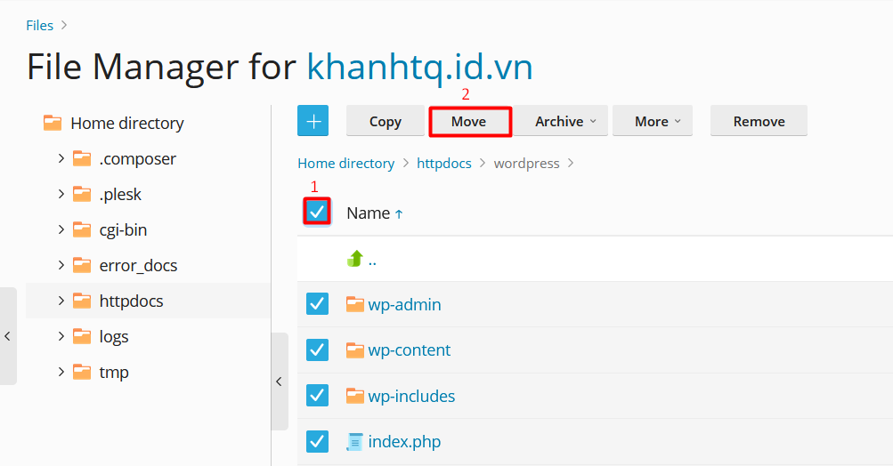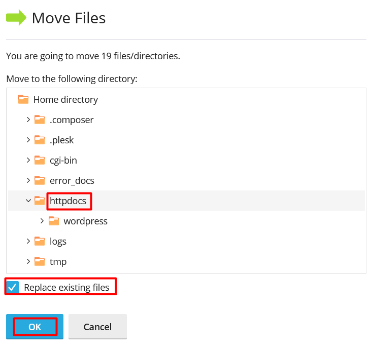 Chọn thư mục cần di chuyển đến, ở đây là httpdocs. Tích chọn Replace existing files để ghi đè các tệp trùng tên đang tồn tại (nếu muốn) và nhấn OK.