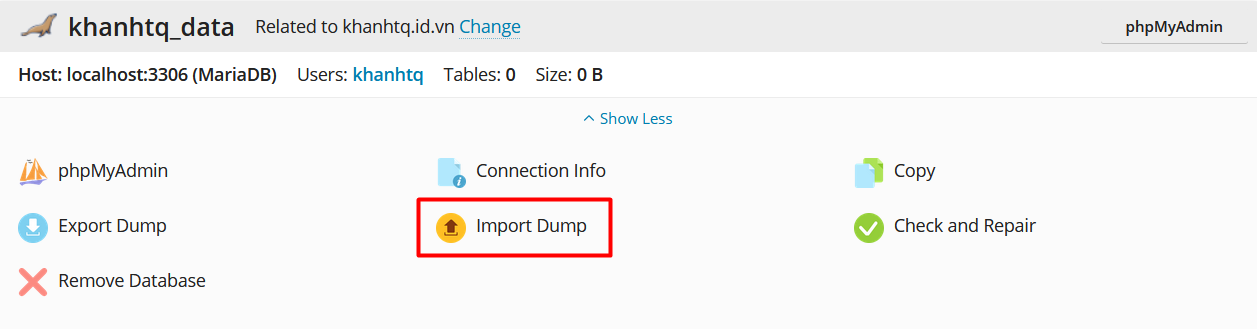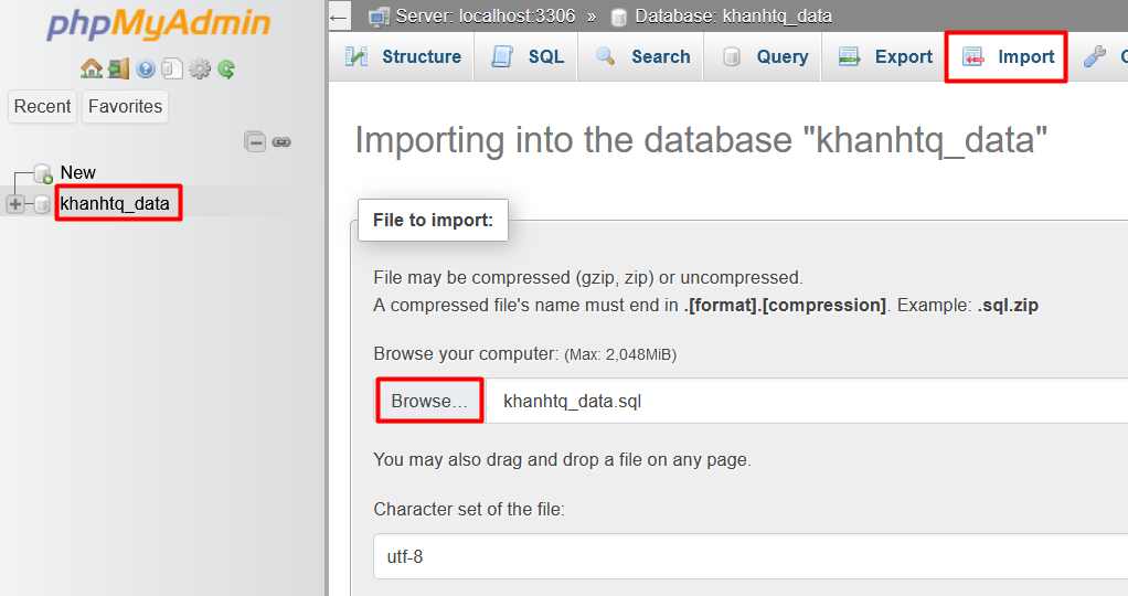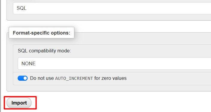 Sau đó, kéo xuống dưới và chọn Import để bắt đầu quá trình nhập dữ liệu cho database.