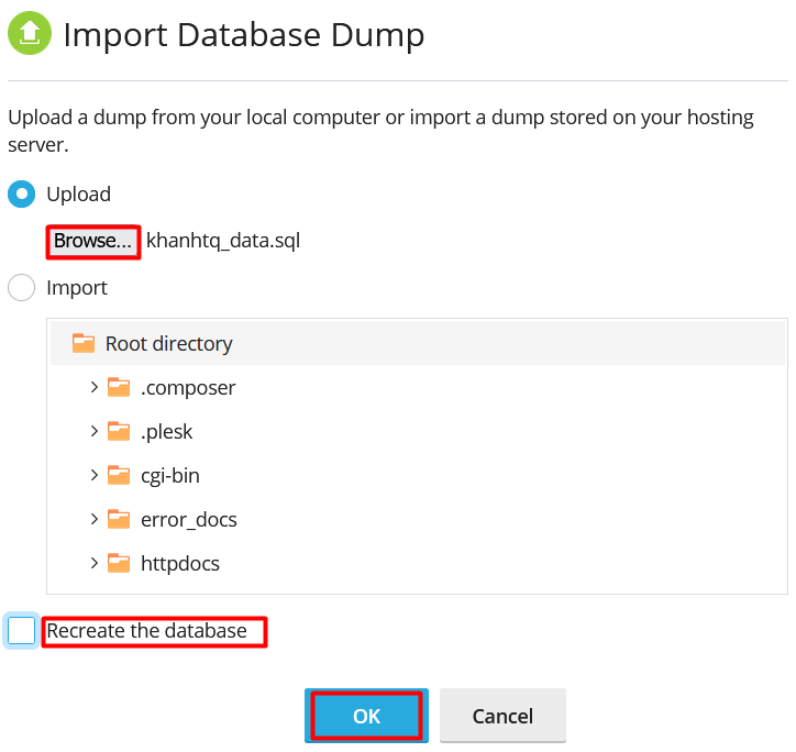 Chọn tệp dump database cần nhập. Tích vào Recreate the database để tạo lại database (nếu muốn). Sau đó bấm OK.