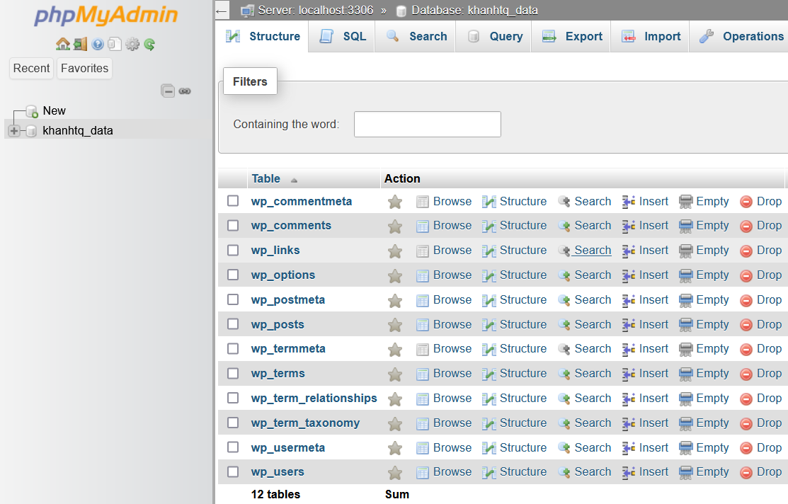 Nếu nhập dữ liệu thành công sẽ thấy các bảng trong database hiện trên màn hình khi chọn vào database đó.
