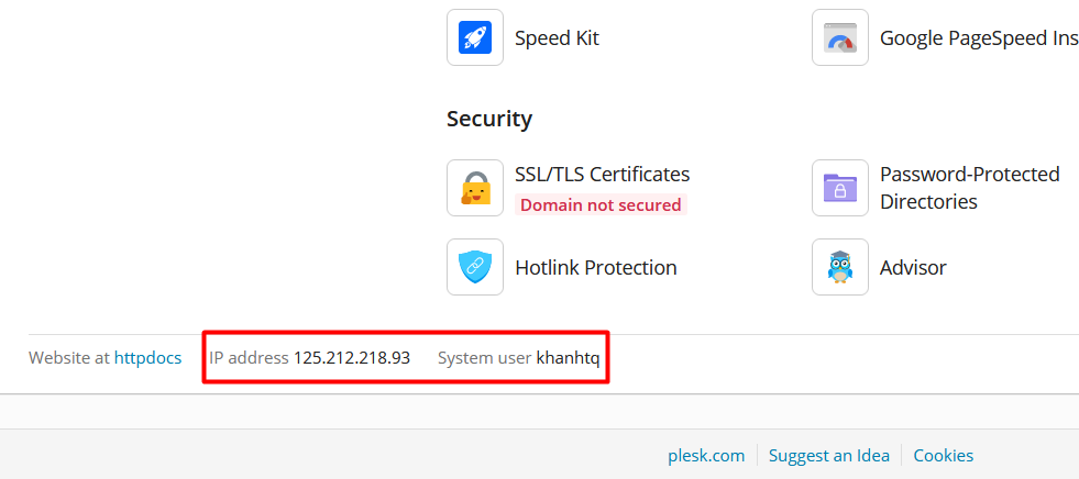 Có thể xem username, IP ngay trong giao diện Website & Domains của Plesk phía dưới cùng.