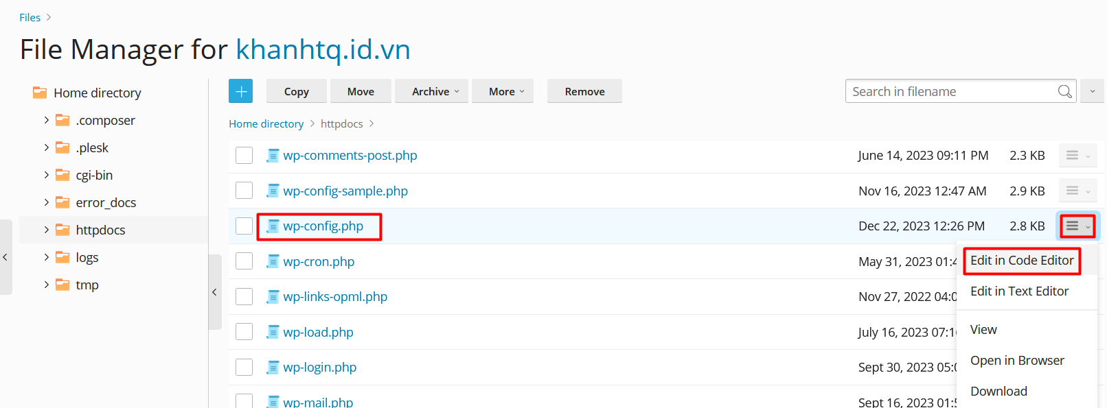 Trong giao diện Files của Plesk, chọn biểu tượng 3 dấu gạch ngang bên phải của tệp wp-config.php và chọn Edit in Code Editor để vào giao diện chỉnh sửa.